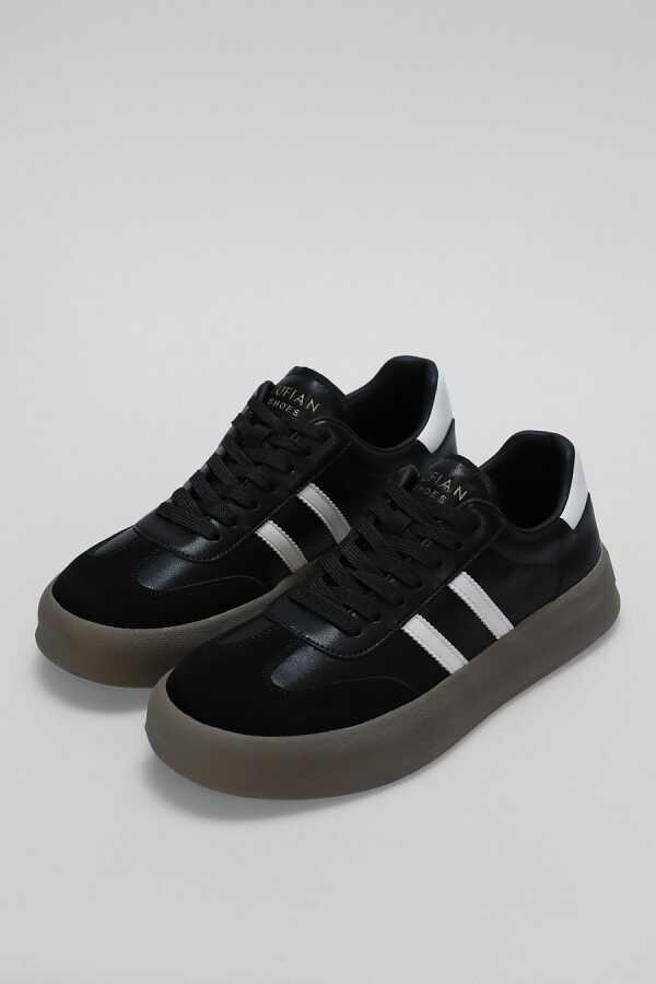 Model : Lufian Samuel Sneaker (kod 111230261) Cinsiyet : Erkek Dış Materyal : Suni deri (dış yüzey), hijyenik görünüm için beyaz/siyah seçenekler İç Materyal/Astar : Gerçek deri & tekstil karışımı Taban : Düz taban, kauçuk dış taban, poli iç taban; orta topuk (1–4 cm) Bağlama : Bağcıklı klasik sneaker tasarım Topuk Tipi : Düz topuklu, ortopedik taban desteği ile gün boyu rahatlık sağlar Ortam : Günlük kullanıma uygun günlük/casual sneaker Menşei : Türkiye (bazı kaynaklarda Mısır menşeli varyasyonlar da bulunmakta